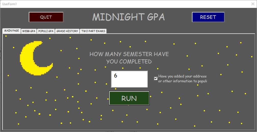 Midnight GPA is an academic performance tracking program meant for Webb students. The aforementioned program has several capabilities. The main capability of the program is its ability to import grades from the Populi grade reports and output them into the GPA tab. The other capabilities of this program include displaying a GPA calculated like Populi, final grade projection if a quiz or test is dropped, minimum final exam score to earn a user-specified grade, and a chart of semester grades.