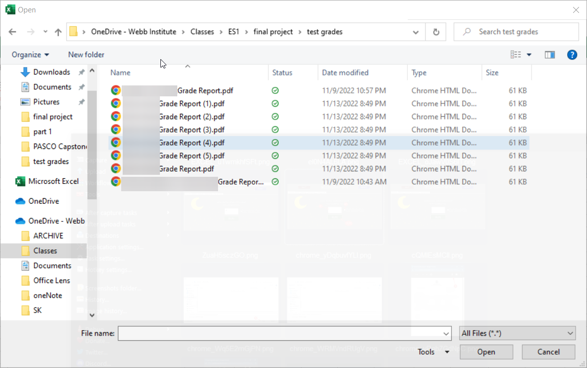Double click each file starting with the one labeled [YOUR NAME]Grade Report.pdf then double click on [YOUR NAME]Grade Report (1).pdf then double click on [YOUR NAME]Grade Report (2).pdf and so on until all of the grade reports have been imported. After completing these steps the WEBB GPA, POPULI GPA, and GRADE HISTORY tabs should be populated. Note that any errors that occur will stop the program, display a message informing the user of an error, and instruct them to ensure they followed the instructions on transcripts. It will also reset the program.