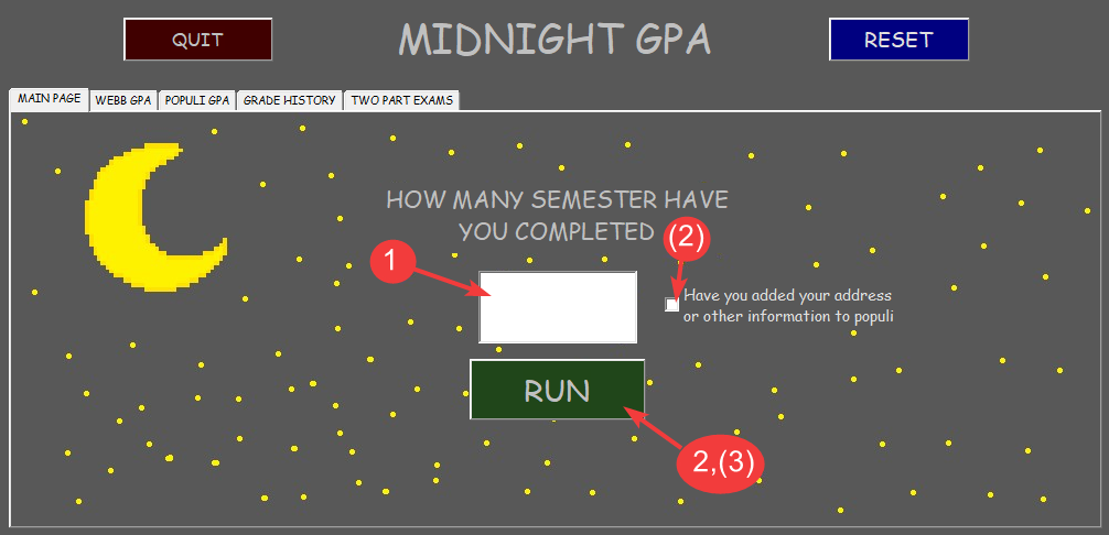 Next, enter the number of semesters you have taken at Webb this should be equal to the amount of files you have downloaded this is done where the one arrow is pointing. If you have entered any sort of extra personal information into Populi please check the box labeled two. Last click the run button.